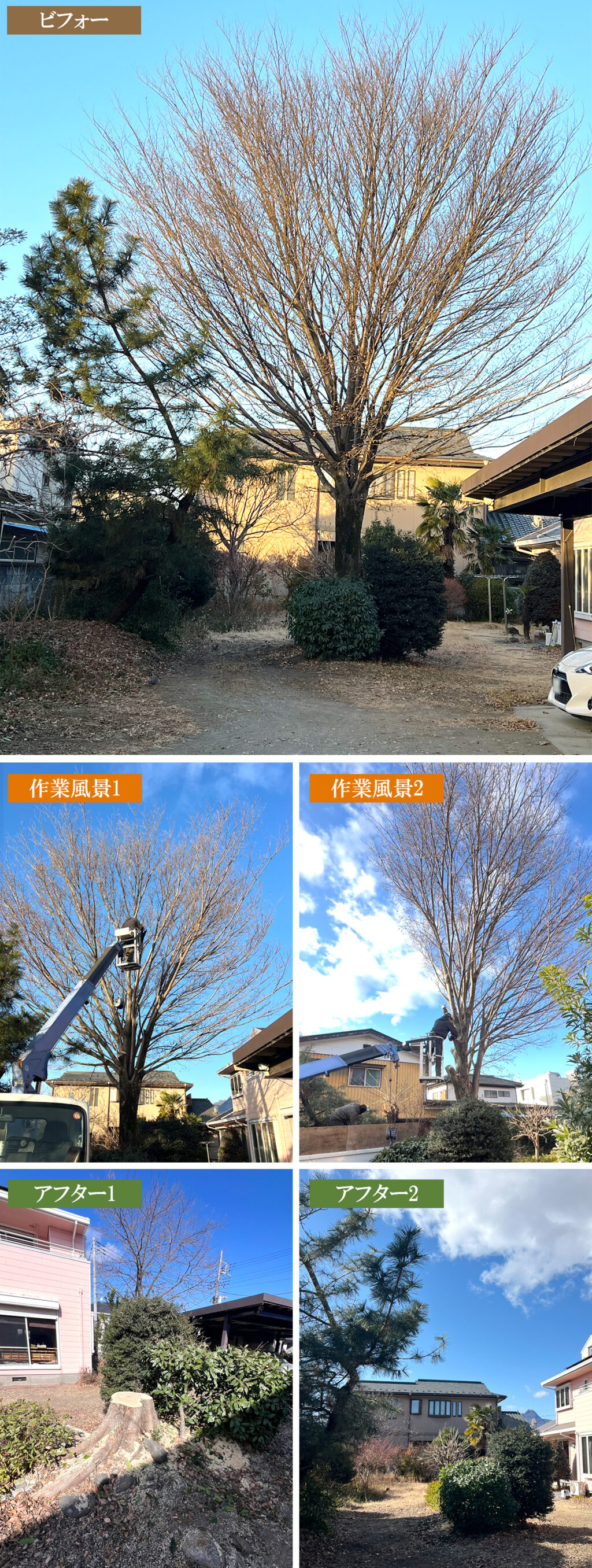 群馬県伊勢崎市にて一軒家、敷地内のケヤキの伐採作業をおこなわせていただきました。 お見積り・ご相談・ご提案、無料となります。 お気軽にお問合せくださいませ。